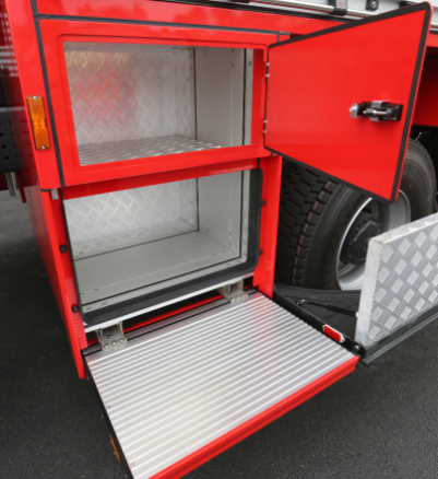 3.2 | 儲物箱:車輛設(shè)有(9個)防水、防塵的鋁合金卷簾門,卷簾門觸發(fā)電磁傳感器自動開關(guān)LED照明;在兩側(cè)卷簾門下方及后橋輪胎處設(shè)有翻轉(zhuǎn)腳踏板,踏板行程由氣彈簧控制,踏板由整塊特制高強(qiáng)度鋁型材裁剪并與附件無焊接組裝而成、站立面防滑,每個踏板可稱重靜載荷250kg,便于取放儲物箱內(nèi)器材。 |