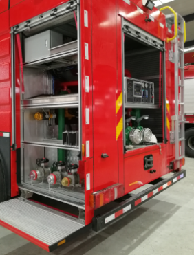 3.1 | 結(jié)構(gòu)設(shè)計(jì):鋼制框架和鋁合金型材專用連接件結(jié)構(gòu)。合理設(shè)計(jì)并增加器材放置空間,放置器材隔斷空間可調(diào)整。對車廂內(nèi)部需要經(jīng)常檢測的部件,在適當(dāng)部位須安有活門,其他需要進(jìn)入車內(nèi)部檢查和維修的地方也應(yīng)敞開或有可移動(dòng)的板;器材箱應(yīng)具有排水功能。具有自重輕、強(qiáng)度高,外觀平整美觀, 內(nèi)部空間調(diào)整方便、空間利用率高、維護(hù)便捷等特點(diǎn);主線路布置在骨架型材板內(nèi),可安全保護(hù)、防止損壞;內(nèi)飾底板為3mm厚的氧化鋁花紋板,通過具有彈性、高粘接強(qiáng)度的進(jìn)口連接密封膠與主骨架連接;前部器材箱、中部罐體、泵室位于車輛尾部。 |